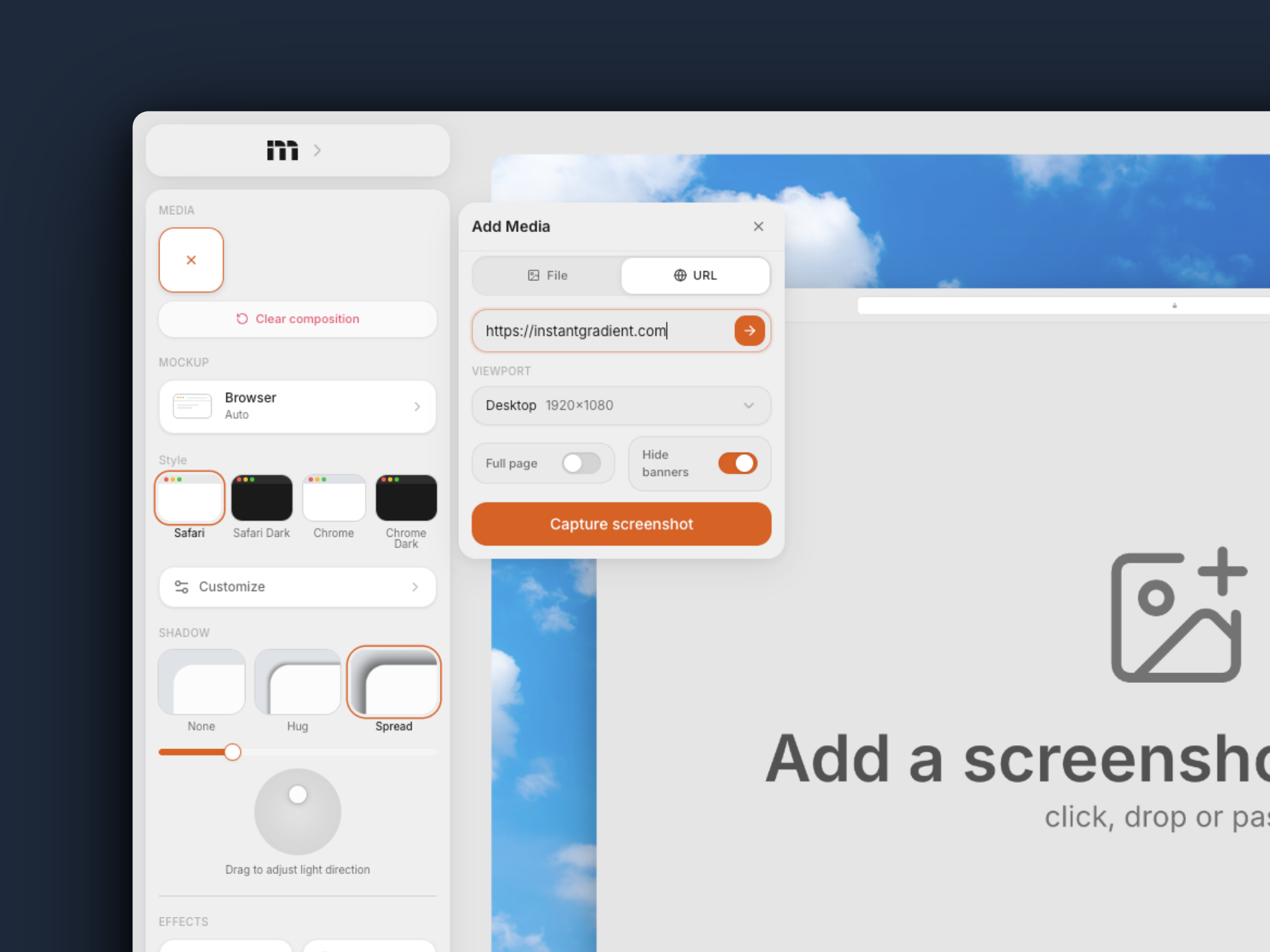 You want to show your website inside a laptop or browser frame. So you open Chrome, take a screenshot, crop out the tabs and bookmarks bar, paste it into a mockup tool, resize it to fit the frame, realize the aspect ratio is wrong, redo the crop, and then spend five minutes picking a background.
